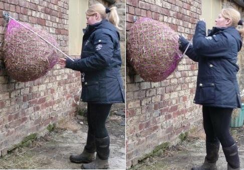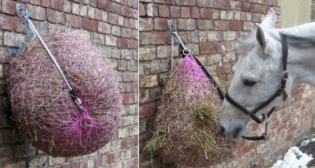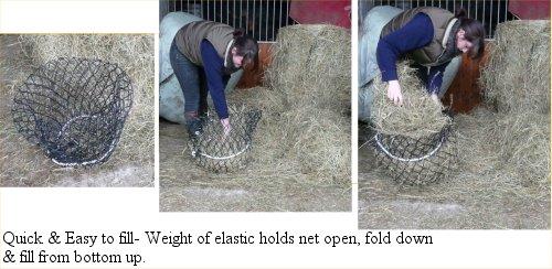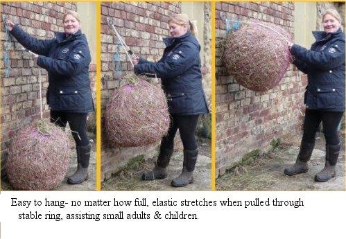 Rapide et facile à remplir, ce filet a foin innovant dispose d'un élastique élastique qui maintient non seulement le filet ouvert pour le remplissage, mais il permet également de suspendre facilement - sans attacher ni nouer, il suffit d'attacher le crochet à la base du haynet.